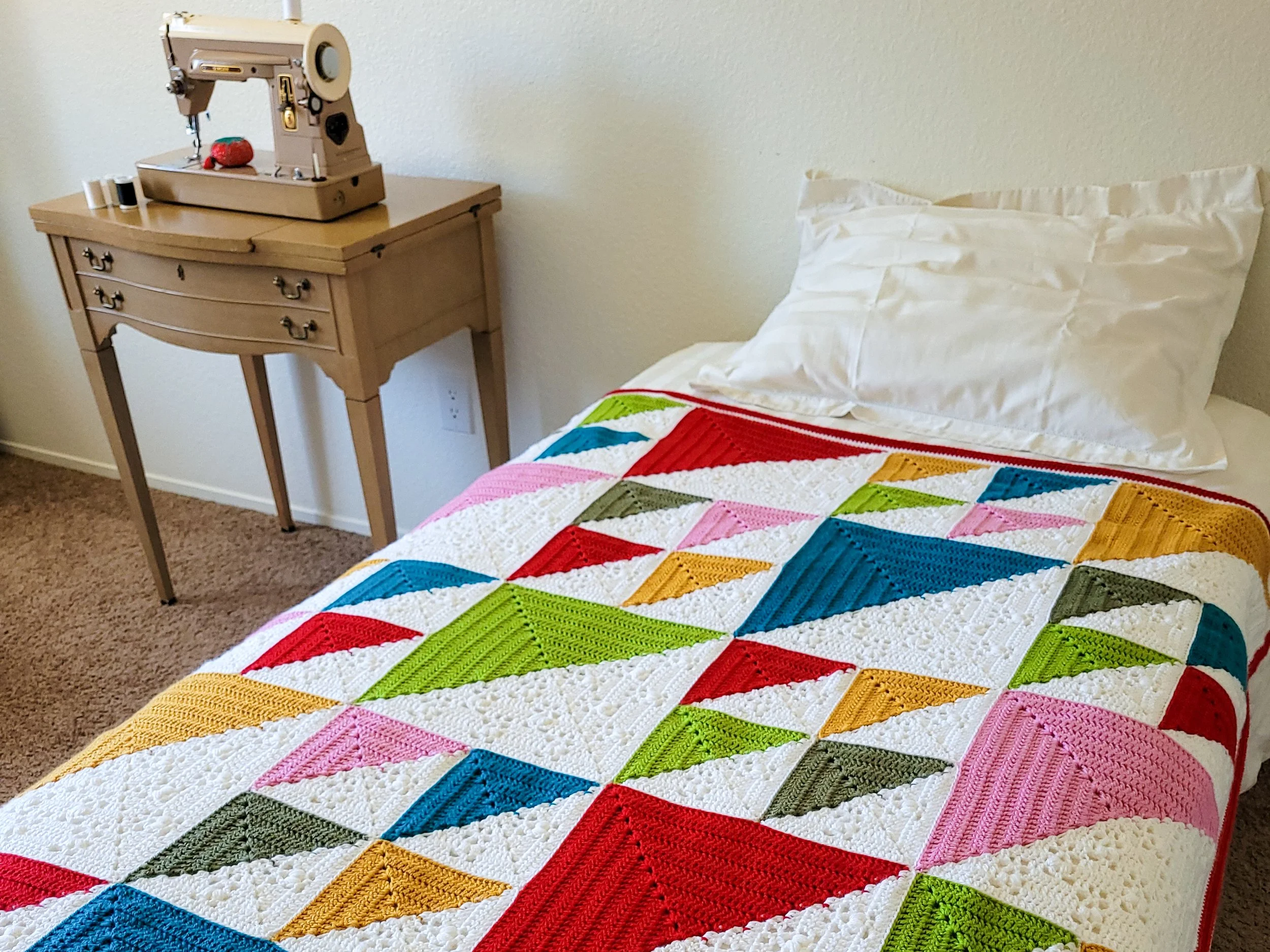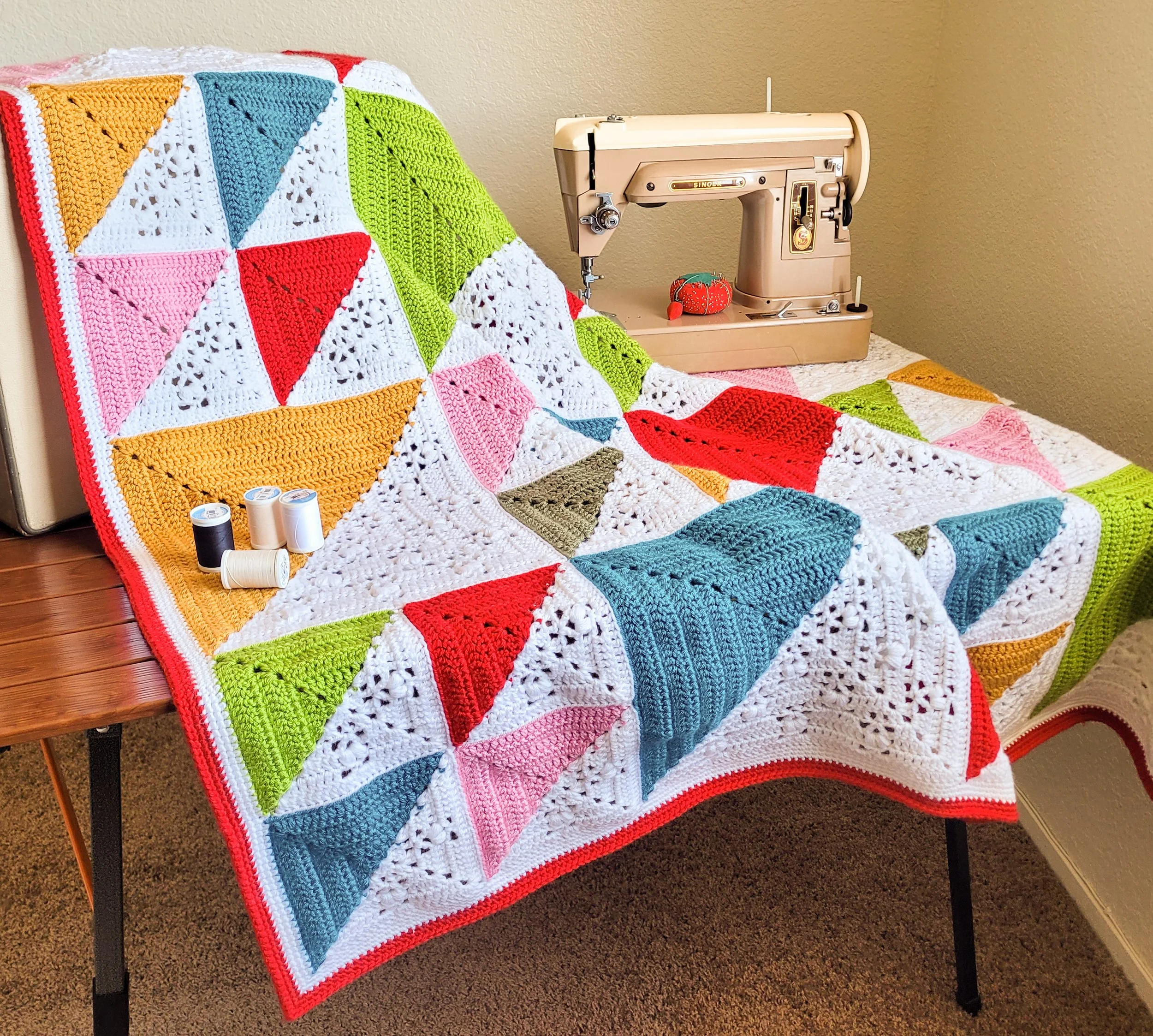 In this quilt-inspired crochet blanket, classic half square triangles are crocheted with two colors in each round. Two sides are crocheted in one color before changing color on the second chain in the corner. The remaining two sides are crocheted with the new color before joining and turning at the end of the round.