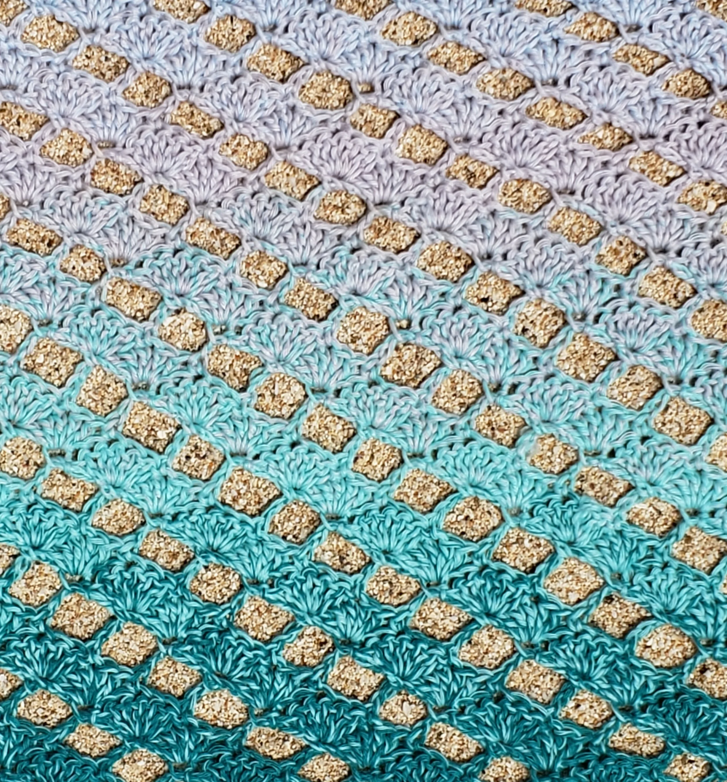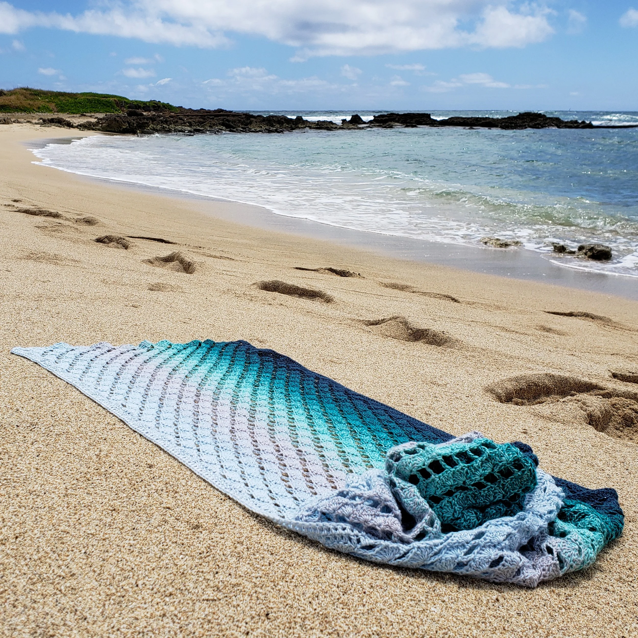 Inspired by ocean waves nearing the shore, the Diagonal Shells Wrap features a yarn with a slow color change from deep sea green to aqua to misty light blue.