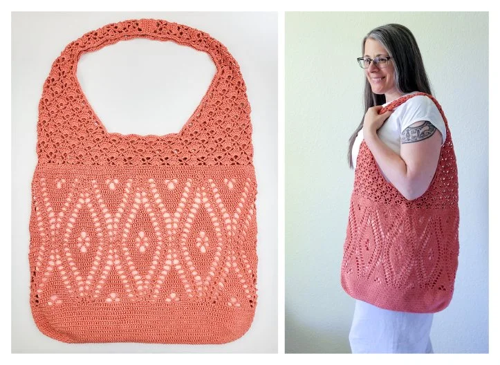 Bag is crocheted from the bottom up, starting with an oval worked in double crochet to create a sturdy base. The body is stitched using a diamond lace pattern before shifting to a shell eyelet pattern on the top edge. Next, the left and right sides of the strap are worked with simple shaping at the beginning and ends of rows. Finally, the two ends of the strap are joined with single crochet and a single crochet edging is added.